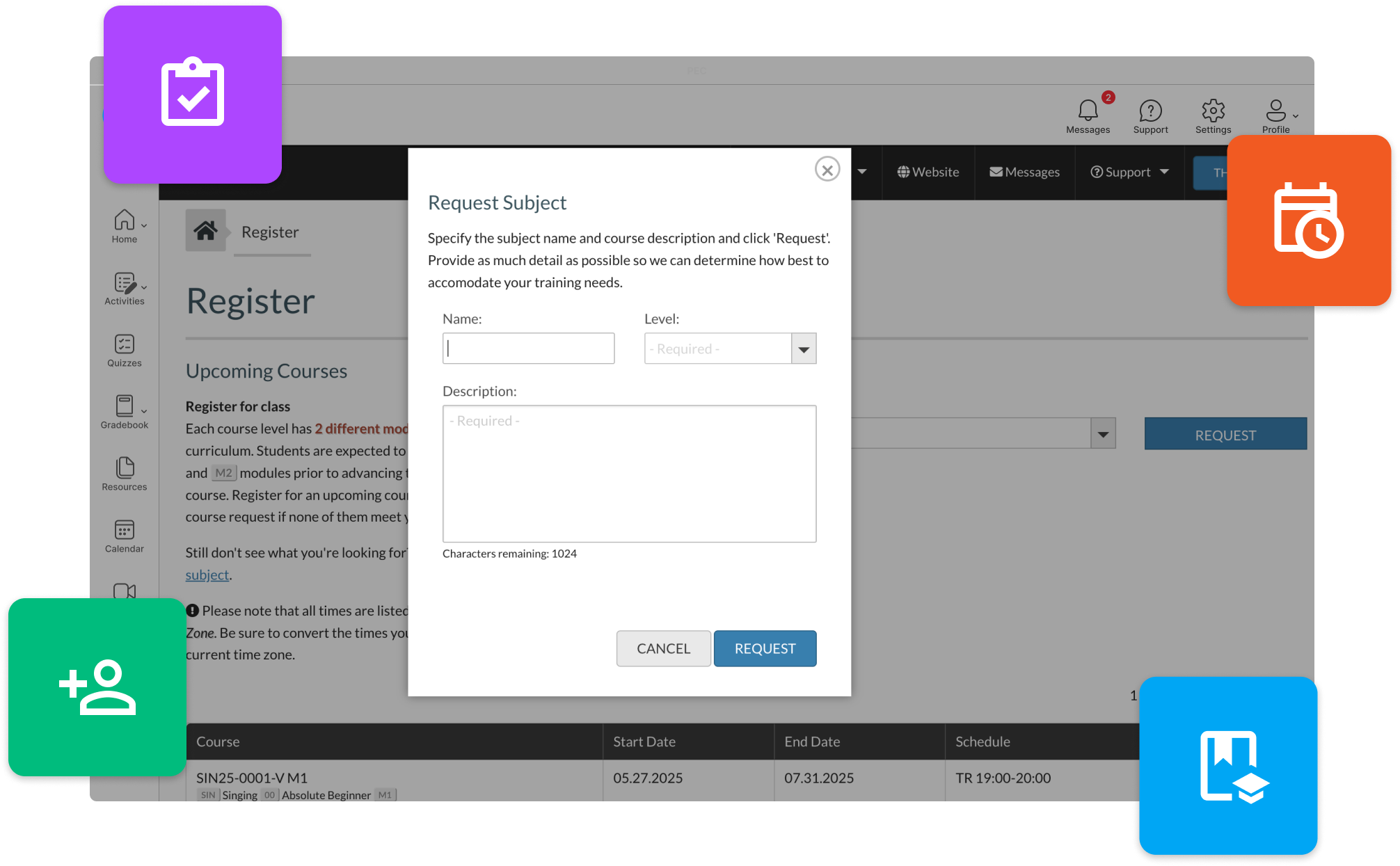 - Native integration with the virtual classroom, ensuring sessions, attendance, and materials are automatically linked to each course.